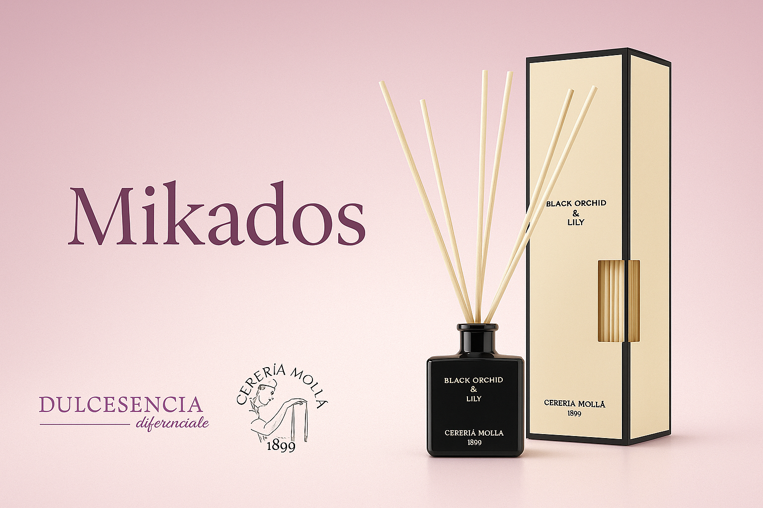 Los mikados de Cerería Mollá 1899 son el equilibrio perfecto entre elegancia, diseño y perfume natural. Cada difusor está elaborado de forma artesanal con aceites esenciales que se liberan lentamente a través de las varillas, llenando el ambiente de una fragancia continua y envolvente. En Dulcesencia encontrarás la colección completa de mikados de Cerería Mollá 1899, con aromas sofisticados que transforman cualquier estancia en un espacio lleno de armonía y estilo.