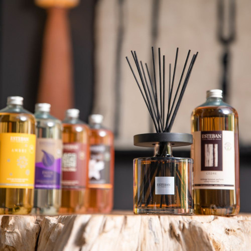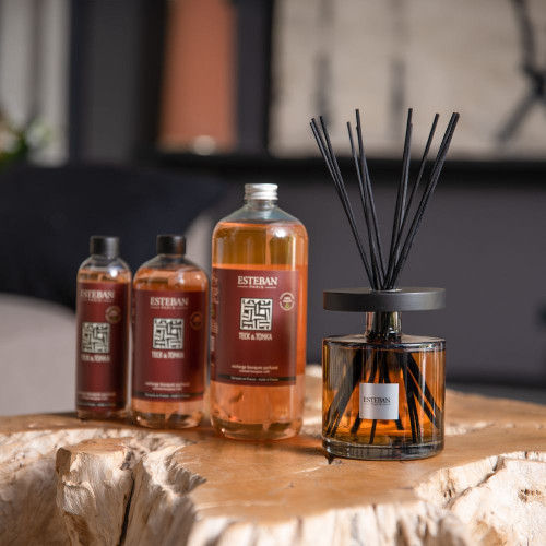 Mikado ESTEBAN PARIS Ellipse Teck & Tonka 500 ml perfuma el hogar con una fragancia intensa, cálida y sofisticada donde la madera de teca se fusiona con la dulzura envolvente de la haba tonka. Un aroma profundo y elegante que aporta carácter y distinción a cualquier espacio.