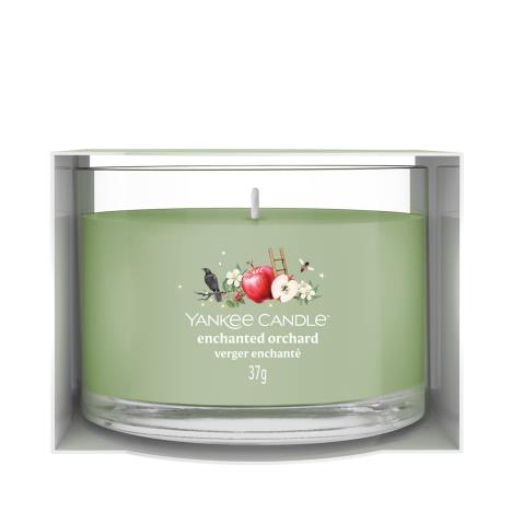 Vela Yankee Candle Enchanted Orchard Mini 37g perfuma el hogar con una fragancia afrutada y luminosa que recuerda a un huerto lleno de frutas maduras bajo la luz del sol. Un aroma alegre y jugoso que combina notas dulces y frescas creando un ambiente acogedor y lleno de vitalidad.